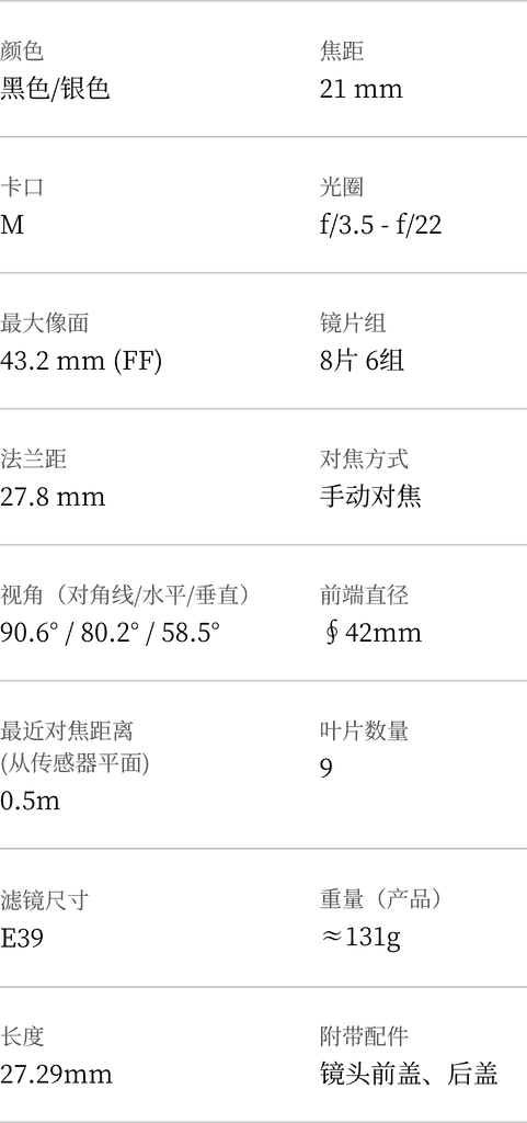 21mm f/3.5采用紧凑设计,全镜仅重131克,即便长时间手持也轻松无负担。从法兰面至前端全长仅27mm,身形小巧,便于收纳与携带。低调的外观让拍摄者在创作时不易被察觉,更能捕捉真实自然的瞬间。特别适合街拍、旅行、纪实等对机动性有要求的拍摄场景。