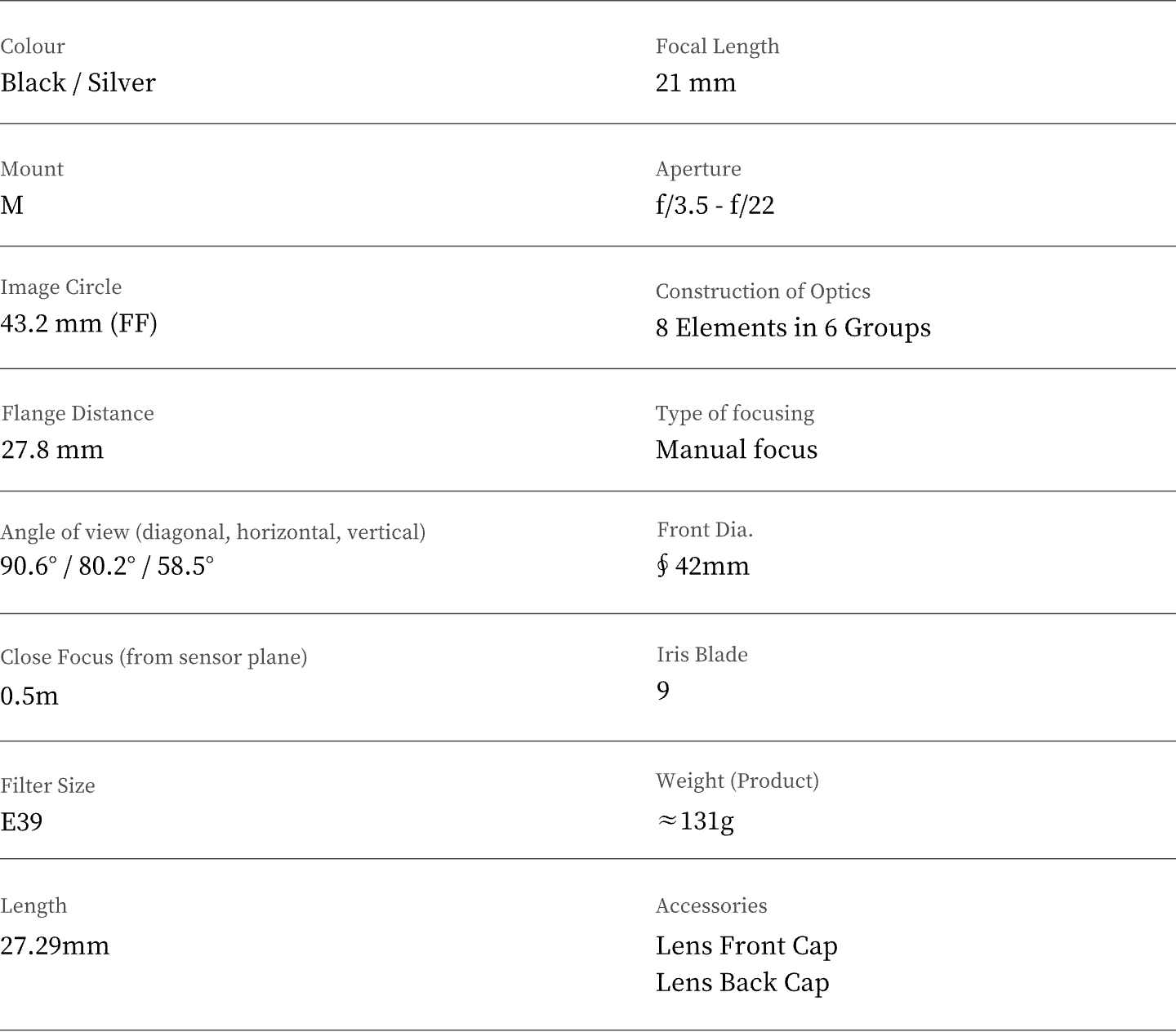 The Ksana 21mm f/3.5 keeps things light and agile. Measuring just 27mm from mount to front edge and weighing only 131g, it fits easily into any bag and stays comfortable in hand—even during long handheld sessions. Its understated profile avoids drawing attention, letting you work quietly and capture genuine, unposed moments. Highly portable and discreet, it's made for street, travel, and documentary photography.
