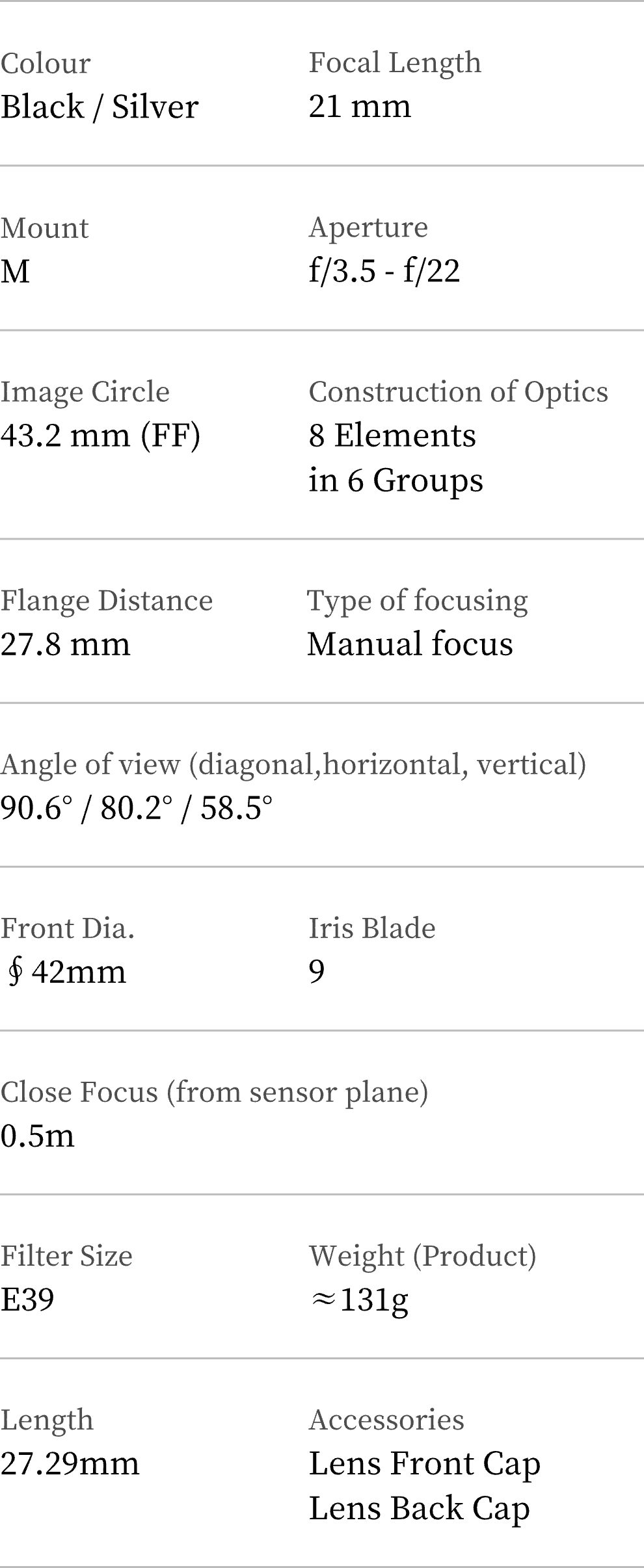 The Ksana 21mm f/3.5 wide-angle lens offers an 80.2° horizontal field of view on full-frame cameras, expanding the sense of space and adding dramatic impact.